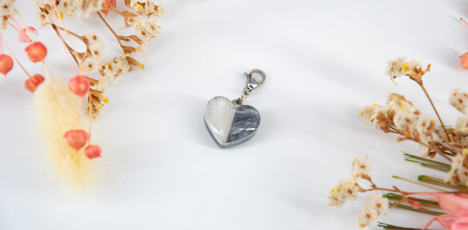 Ein handgemachter Charm in Herzform ist eine wunderbare Möglichkeit, um ein Andenken an ein geliebtes Tier oder Menschen bei sich zu tragen. Der Charm lässt sich beispielsweise an einer Kette oder einem Armband anbringen und ist somit immer in deiner Nähe.