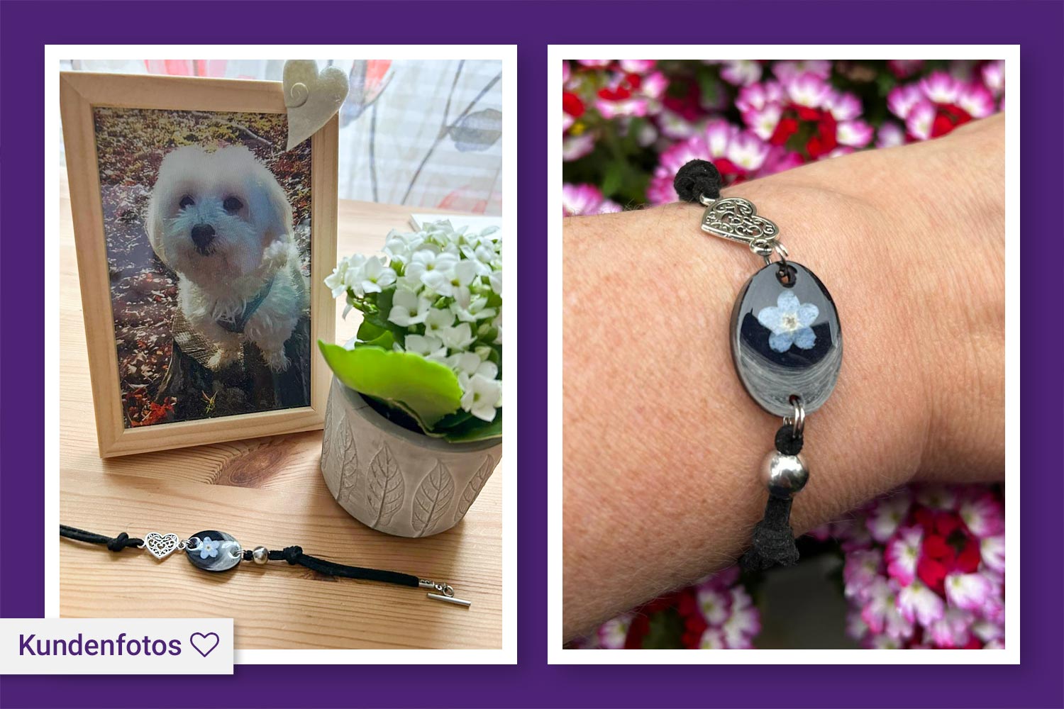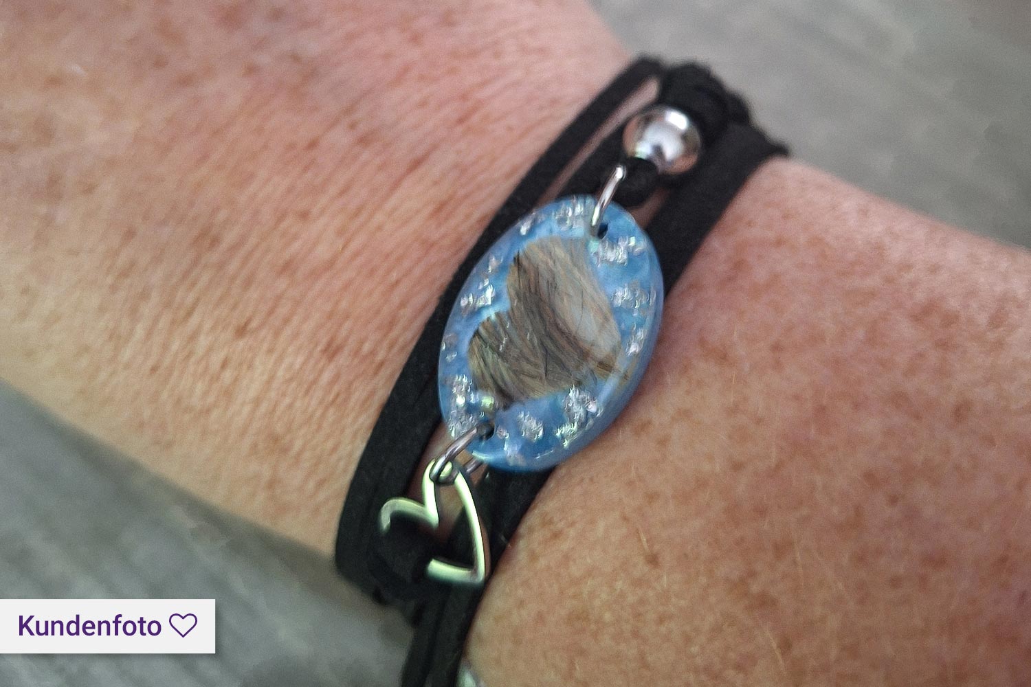Ein Armband mit einem handgefertigten Kunstharzanhänger und kleinem Herz aus Edelstahl, in dem das Haar eines geliebten Tieres oder Menschens eingearbeitet wird, ist ein ganz besonderer Erinnerungsschmuck. Das Velourslederimitat verleiht dem Armband eine edle Optik und der Kunstharzanhänger wird ganz individuell nach deinen Wünschen gefertigt.